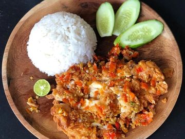 makanan ayam goreng tepung khas Indonesia yang diulek atau dilumatkan bersama sambal bajak