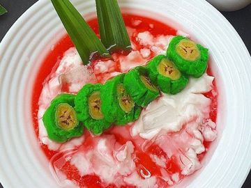 sajian bola tepung berbahan dasar tepung kanji atau aci sampeu, tampilannya seperti bola daging pada hidangan bakso