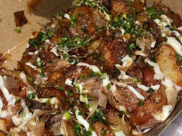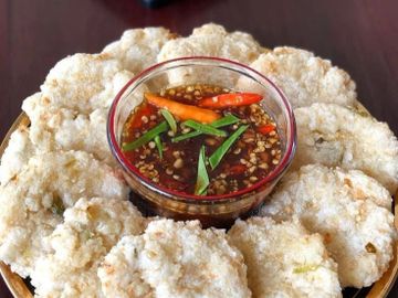 adonan tepung yang dibentuk bola berdiameter 3—4 cm kemudian diisi gurita dan dibakar.
